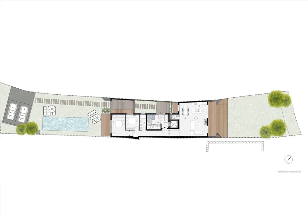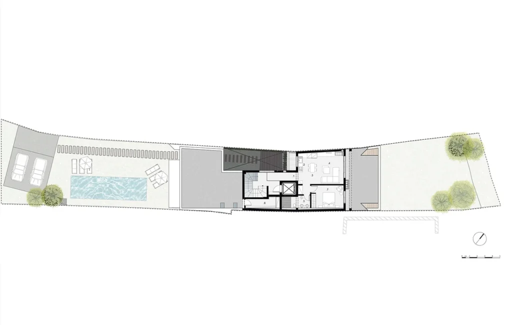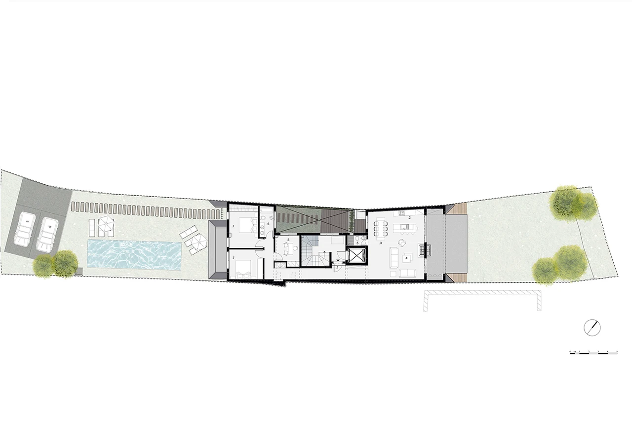 The composition is articulated linearly, through successive rectangular volumes that develop both vertically and longitudinally, integrating dynamically with the natural topography. A defining element is the central core, which houses the atrium, staircase and elevator, acting as the connector between the living zones. The main spaces are organized on either side, forming clearly defined living and sleeping zones.