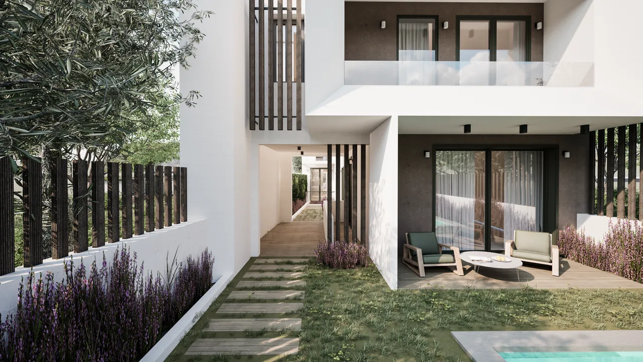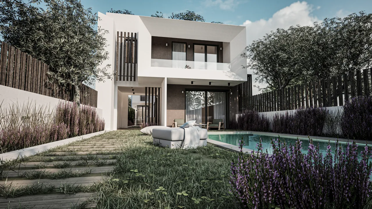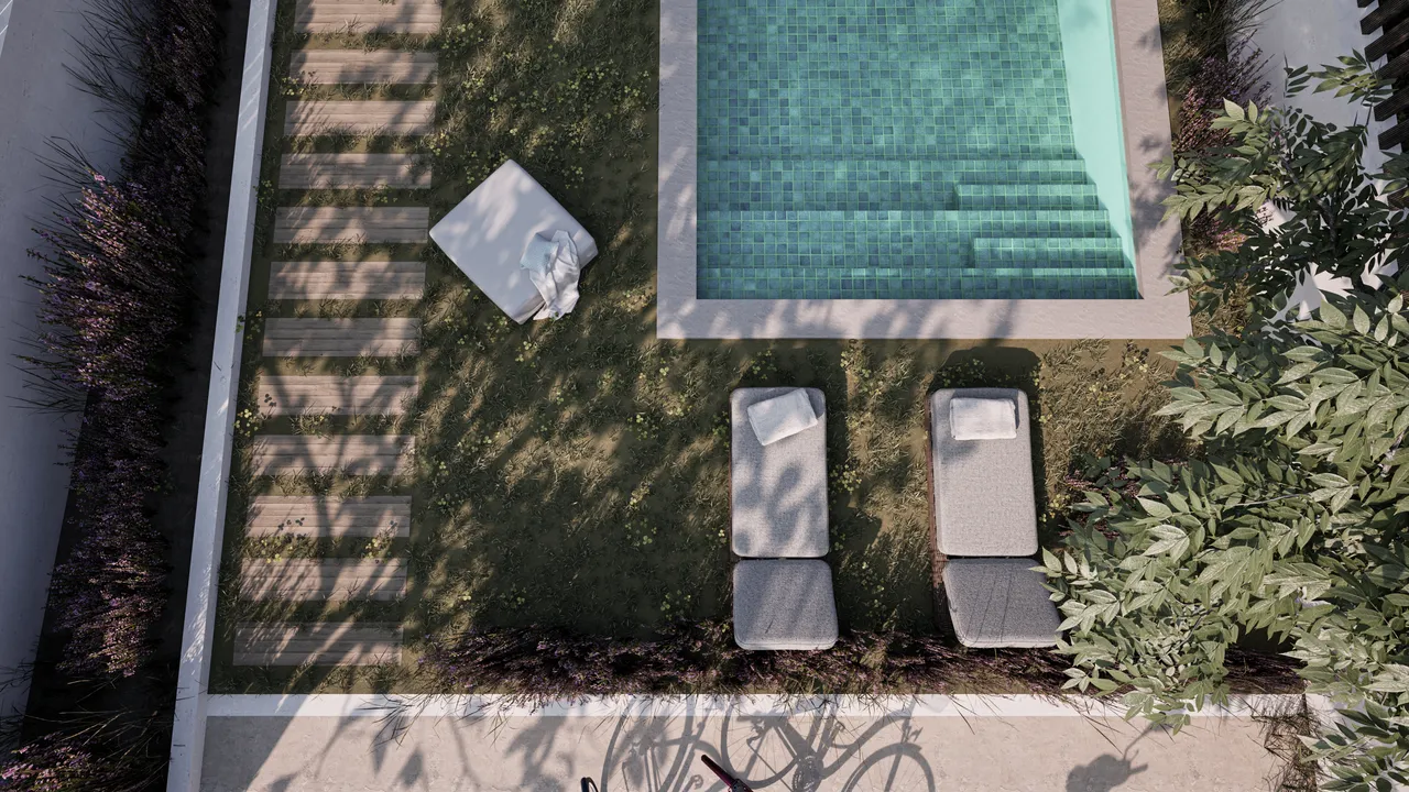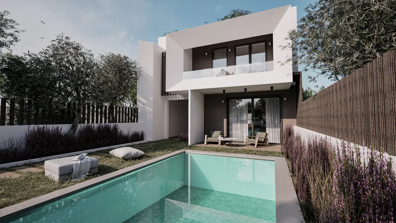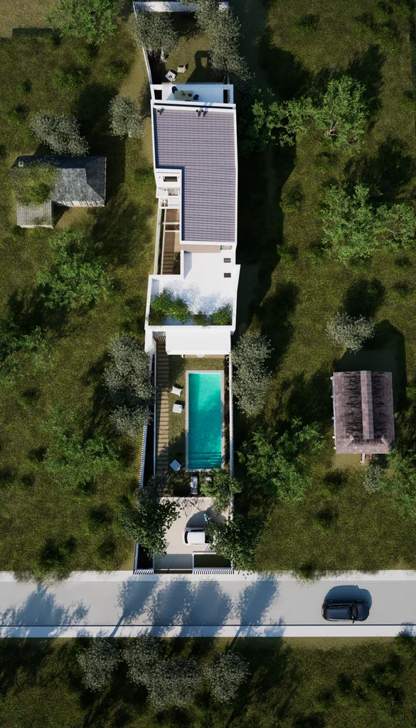 On the ground floor, the first residence features an open-plan living room, kitchen and dining area oriented toward the back outdoor space. The bedrooms and bathroom are located near the main entrance, in direct relation to the garden and swimming pool. Additionally, parking and storage areas are provided. The upper floor accommodates the second residence with a similar layout, ensuring privacy and independence. The attic includes an office, bathroom, storage room and bedroom, while also offers access to the rooftop terrace.