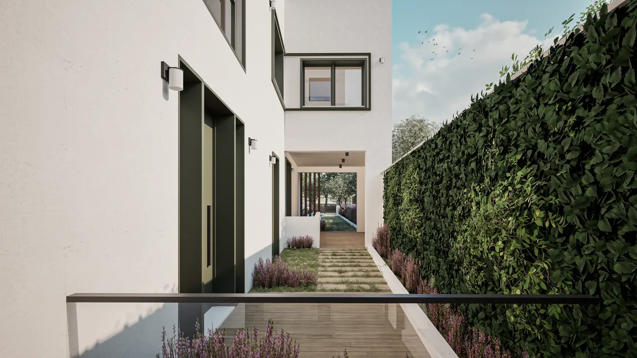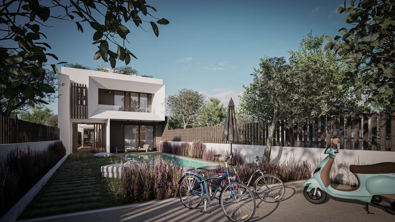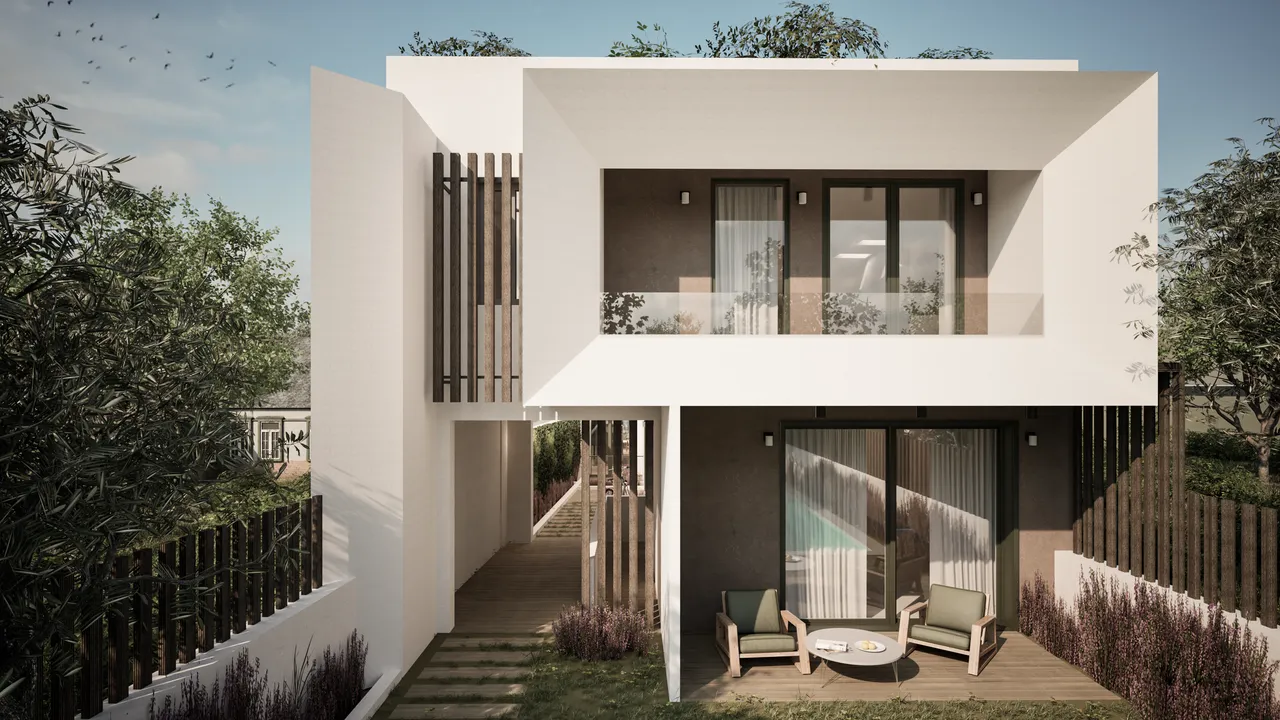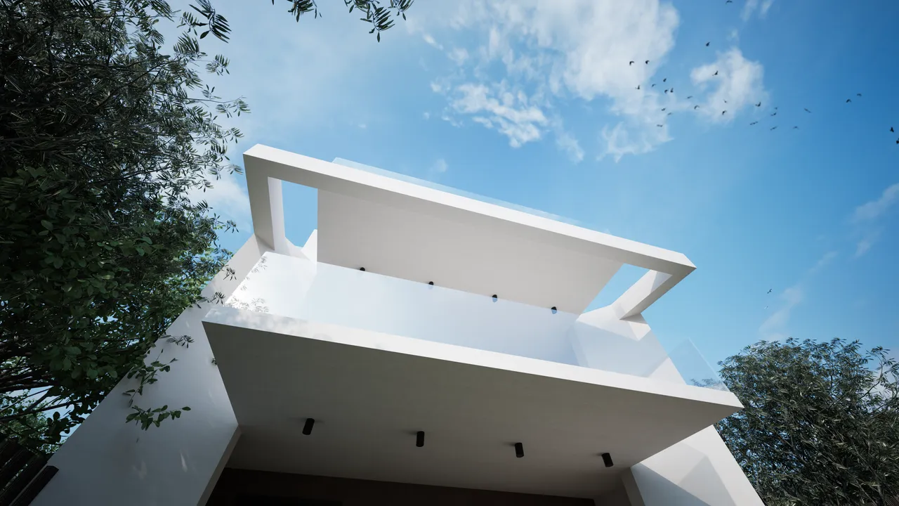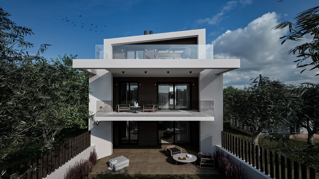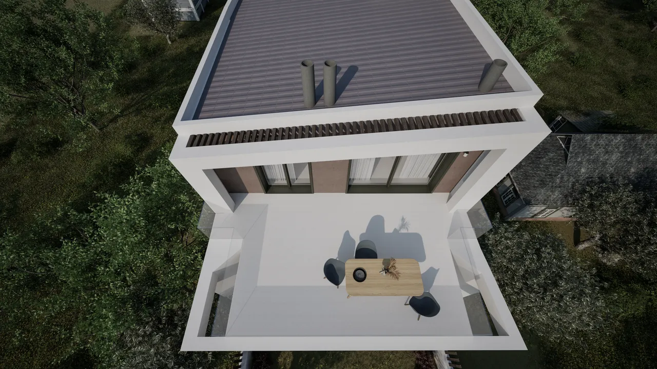 The outdoor area is designed as an extension of the living space, incorporating recreational, lounge, and outdoor kitchen functions. The arcade created at the atrium on the ground floor, through which access to the building is provided, serves as a transitional space between interior and exterior. The architectural proposal expresses a balance between functionality, clean geometry and connection with the landscape, shaping a cohesive, contemporary residential environment.